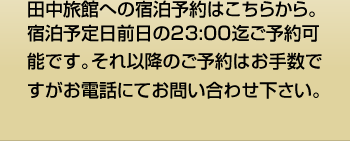 田中旅館へのご予約は、右記バナー全ページ下部のバナーかコチラより承っております。宿泊予定日2日前の24:00迄ご予約可能です。それ以降の急ぎのご予約はお手数ですがお電話にて承ります。